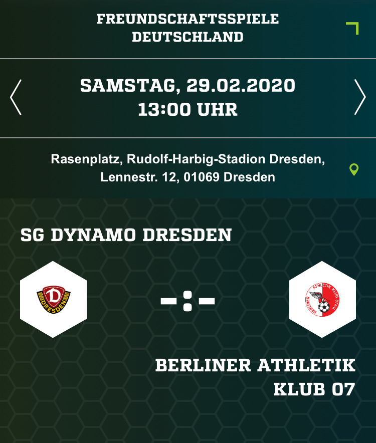 Zitat von Awayday am 26. Februar 2020, 11:02 am UhrAm Samstag den 29.02.2020 13 Uhr soll es im RHS ein Testspiel gegen den Berliner AK 07 geben. Ob hier die Reserve welche am Vortag gegen den Jahn Regensburg nicht zum Einsatz gekommen ist auflaufen soll ist unklar. Ebenso unklar bisher ob der Test öffentlich ausgetragen wird.